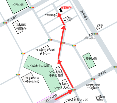 つくばエクスプレス A2出口より徒歩12分 赤い矢印のとおり